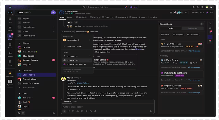 Chatea dentro de las tareas y evita correos eternos. Reemplaza Slack, Teams, Meet.